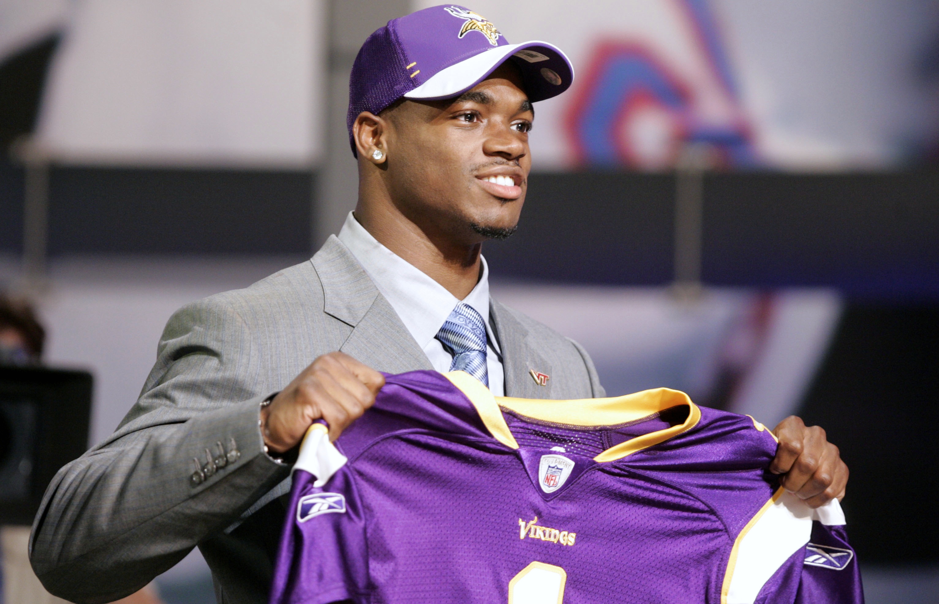 7.) ROCK STAR: ADRIAN PETERSON, RB, Minnesota Vikings (2007) — A body chiseled from stone, the most violent runner since Jim Brown, and eight yards from breaking the all-time, single-season rushing record make AD a rock star. Not to mention him topping 1,250 yards rushing in six of his seven seasons, to go along with three All-Pro selections.